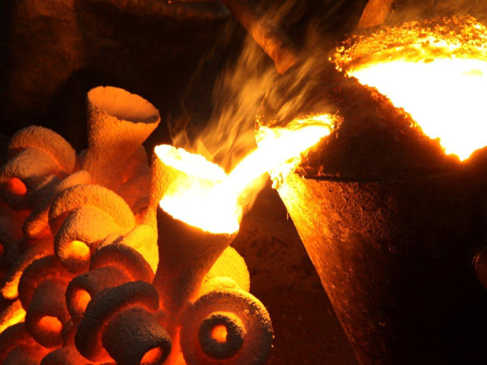 Os cachos incandescentes que saem do forno são colocados em uma esteira de areia para receberem o vazamento do metal líquido. A preparação da liga metálica é realizada seguindo rígidos critérios metalúrgicos e químicos, conforme norma e composição química de cada aço.