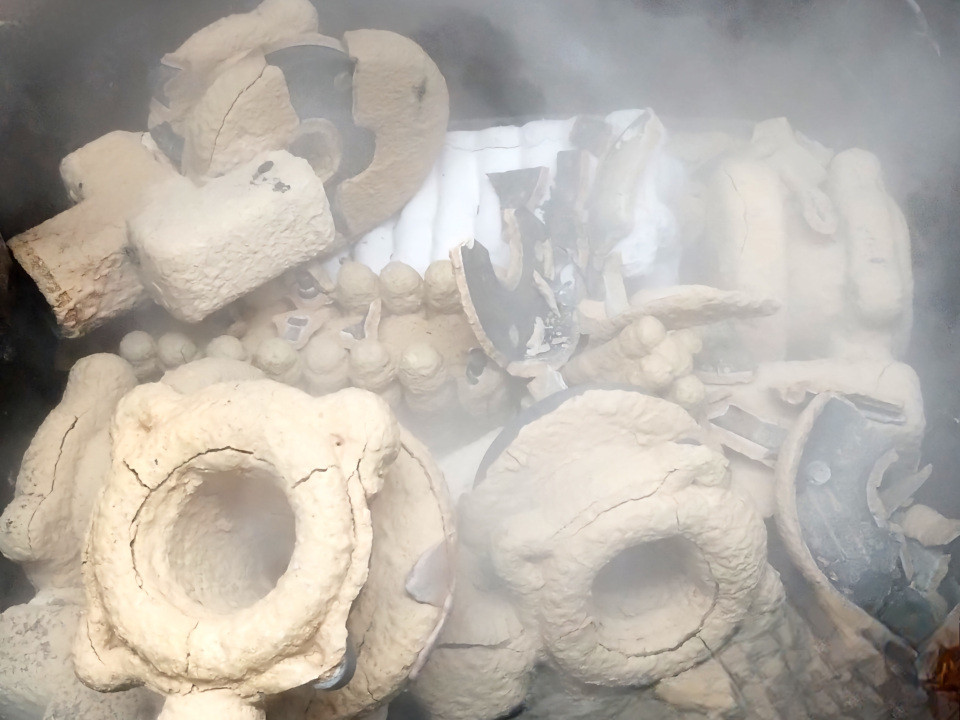 Após o resfriamento total do metal as cascas cerâmicas são submetidas à impactos controlados, que são responsáveis por quebrar a cerâmica liberando as peças metálicas (martelete).