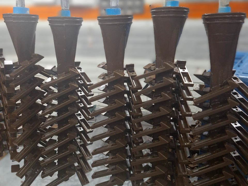 Após os cachos entram no processo de revestimento em sala climatizada, onde recebe uma série de banhos para construção de camadas refratárias, respeitando os tempos de secagem de cada um, para formarem um molde cerâmico capaz de suportar as tensões do processo de fundição.